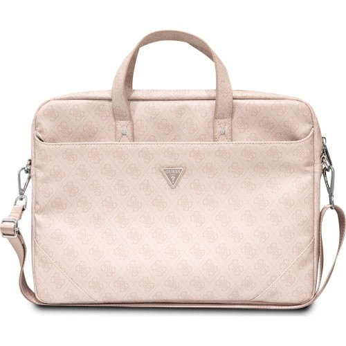 Torba Guess Saffiano 4G Triangle LogoLaptopy do 16'' Klasyczne wzornictwo i precyzyjne wykonanieWyjątkowa seria toreb Saffiano 4G Triangle Logo marki Guess zaprojektowana ze smakiem i stylem. Rozmiar uniwersalny, pasuje do większości laptopów. Zaprojektowana z nadzwyczajną starannością o szczegóły, wykonana z wysokiej jakości miękkiego materiału. Podszewka wewnętrzna - zapewnia ochronę przed zarysowaniami urządzenia.Torba jest pokryta przyjemną i miłą w dotyku fakturą Saffiano wraz z zewnętrznym wzorem 4G i logo Guess.Produkt wyprodukowany na licencji marki Guess.Wymiary zewnętrzne całkowite torby: 31 x 42 x 4 cmKolor producenta: Pink (różowy) Ochrona w pełnym wymiarzePokrowiec zapewnia doskonałą ochronę podczas codziennego użytkowania dodając modnego wyglądu Twojemu laptopowi. Niezwykle funkcjonalny i wygodny w użytkowaniu. Zapewnia ochronę całego urządzenia przed drobnymi uderzeniami oraz zarysowaniami. Poręczna i wygodnaTorbę można nosić na różne sposoby:nylonowy pasek na pleckach dzięki któremu można ją przymocować do rączki walizki podróżnej. odpinany i regulowany pasek na ramię z metalicznymi zapięciami dla wolnych rąk i wygodnego noszenia na ramieniu. dwie małe rączki dla poręcznego chwytu. Dodatkowe kieszenieWykonana z myślą o wygodnym funkcjonowaniu zawiera dwie boczne kieszenie (jedna z przodu, druga z tyłu) zamykane na suwak i jedną dużą główną, która zawiera dodatkowo wewnątrz dwie mniejsze kieszenie. Subtelne wzornictwo i gustowny wygląd to zalety produktów firmy Guess.