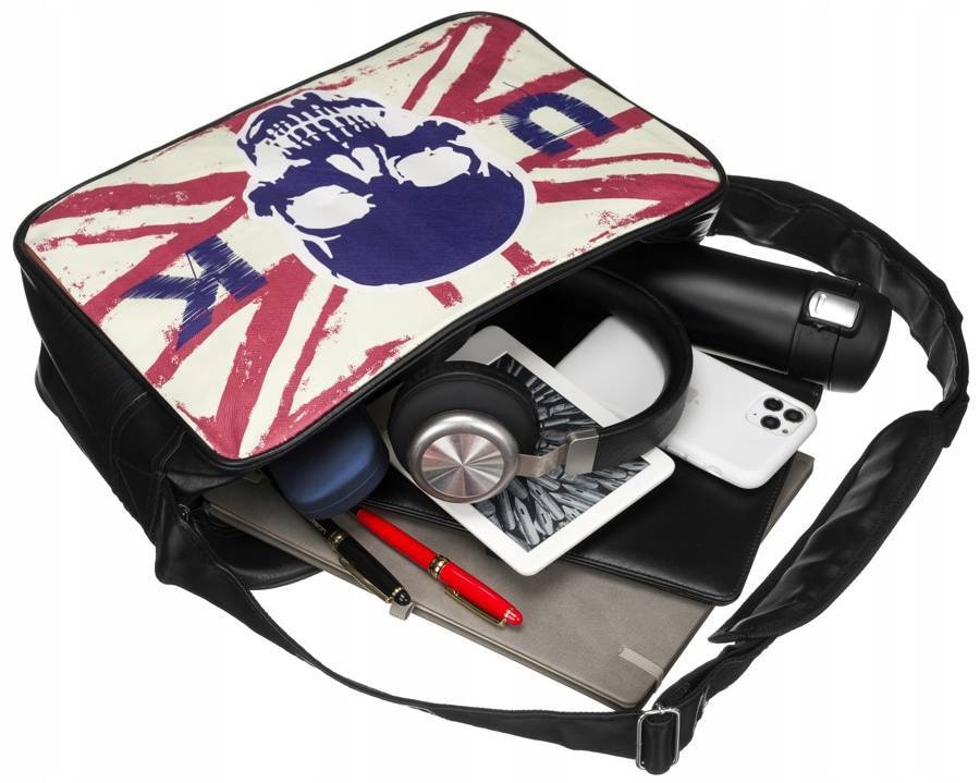 Funkcjonalna torba odszyta ze skóry ekologicznej, zawieszona na szerokim pasku z naramiennikiem. Ozdobiona oryginalnym printem bez problemu zmieści format A4. Jednokomorowa z czterema nóżkami ochronnymi na spodzie i kieszenią zewnętrzną zamykaną na suwak.