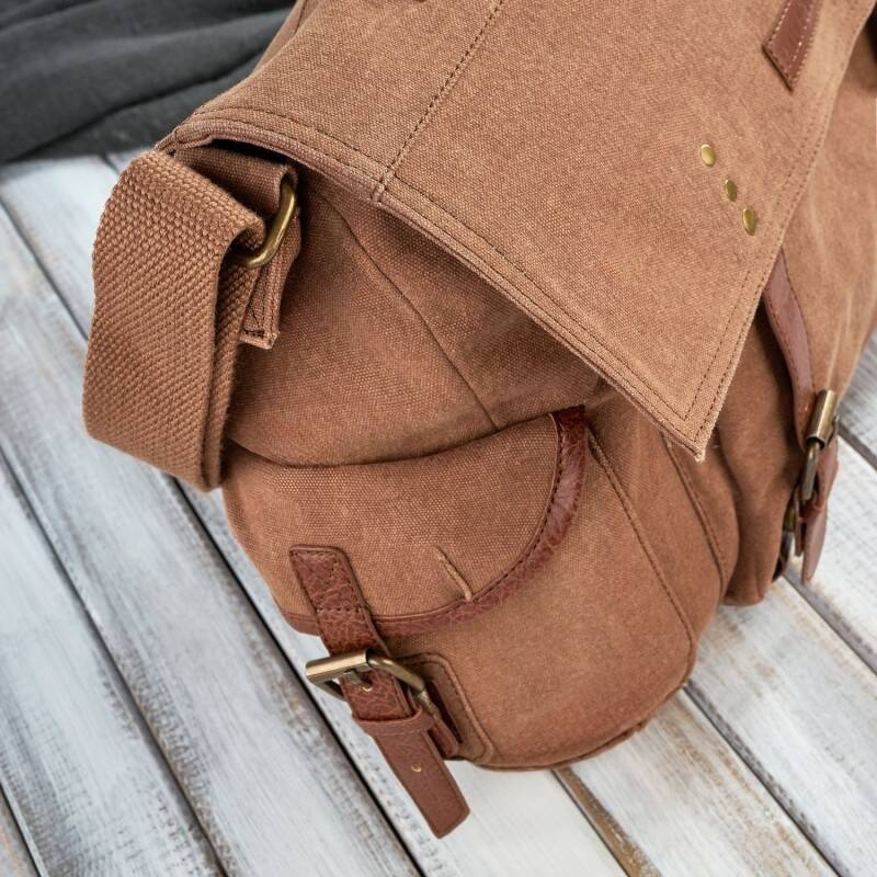 Męska torba na ramię wykonana z bawełnianego, impregnowanego canvasu oraz 100% skóry wegańskiej. Do jej produkcji zastosowano mocne nici oraz designerską, bawełnianą podszewkę w paski. Produkt mieści format A4 i posiada przegrodę dedykowaną na laptopa (15,6”), wyłożoną pianką dystansową. Torba zabezpieczona jest klapą na magnetyczne napy. Pod klapą umieszczono zapinaną kieszonkę na suwak, na najczęściej wyciągane akcesoria. W komorze głównej jest przegroda na laptopa oraz wsuwana kieszeń. Dodatkową przestrzeń do przechowywania stanowią dwie zewnętrzne kieszenie na magnetyczne napy.