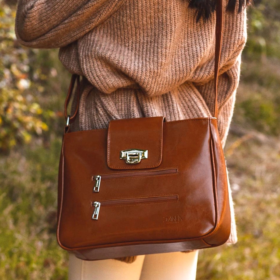 Skórzana torebka damska w kolorze camel, renomowanego polskiego producenta, marki DAN-A. Wzór stworzony dla kobiety eleganckiej, pewnej swojego stylu. Z przodu torebki znajdują się dwie kieszonki z ozdobnymi zamkami. Wymiary: 24,5 x 31 x 9 cm.