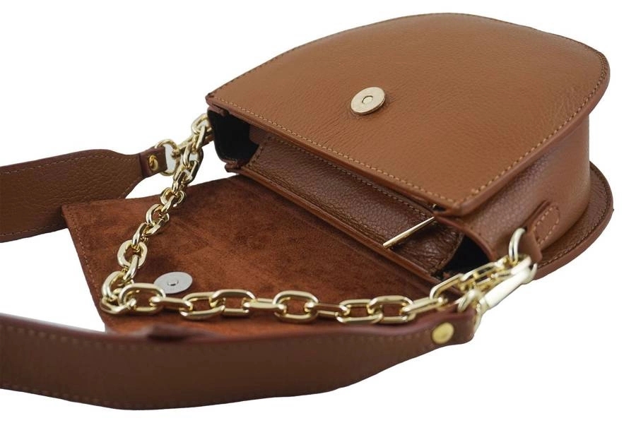 Wnętrze torebki: jednokomorowe wnętrze jest surowo wykończone. Wewnątrz znajduje się mała zasuwana kieszonka mieszcząca np. karty płatnicze. Torebka skórzana z ozdobnym łańcuszkiem posiada złote okucia, jest zasuwana oraz dodatkowo zapinana na zatrzask magnetyczny. Może być noszona na krótszym dopinanym pasku bez regulacji (długość 55cm, wysokość 25cm, szerokość 3.8cm) lub na dodatkowym pasku z regulacją (maksymalna dł. 130cm, maksymalna wys. 65cm). Torebka skórzana z ozdobnym łańcuszkiem (długość 39cm, wysokość 13cm) uzupełni stylizacje kobiet dbających o każdy szczegół garderoby, podążających za najnowszymi trendami.