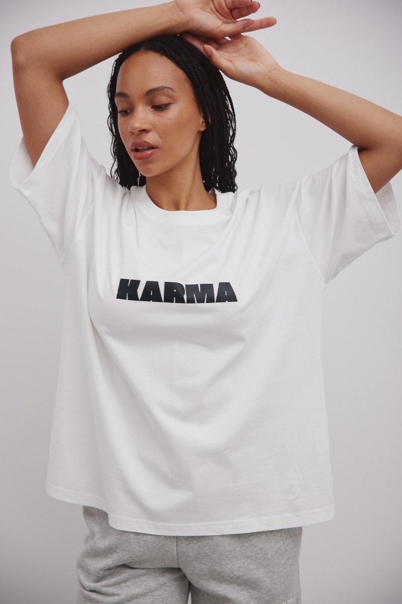 Klasyczny t shirt w kolorze ecru, z nadrukiem w kolorze czarnym . Fason o prostym, pudełkowym kroju ze znacznie obniżoną linią ramion. Rękaw szeroki, przedłużony. Dekolt niewielki, okrągły . Luźna, inspirowana męską garderobą koszulka, która pasuje niemalże do każdego typu sylwetki - świetnie tuszuje wszelkie niedoskonałości i daje możliwość noszenia zarówno w luźnej formie, jak i delikatnie wpuszczonej do spodni, czy spodenek. Gwarantuje komfort i stylowy wygląd. Przód koszulki posiada nadruk w kolorze czarnym z hasłem KARMA. Skład: 95% Bawełna , 5% Elastan ZALECANA PIELĘGNACJA: