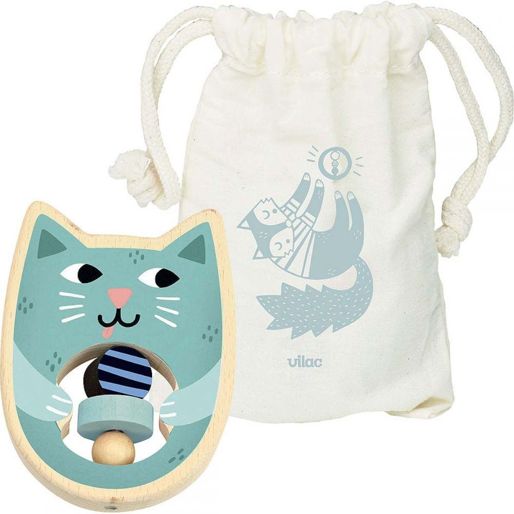 Grzechotka dla niemowląt Kotek francuskiej marki Vilac, to drewniana zabawka dla niemowląt w kształcie niebieskiego kotka. Zabawka zawiera trzy drewniane koraliki dla rozwoju zręczności i małej motoryki maluszka.