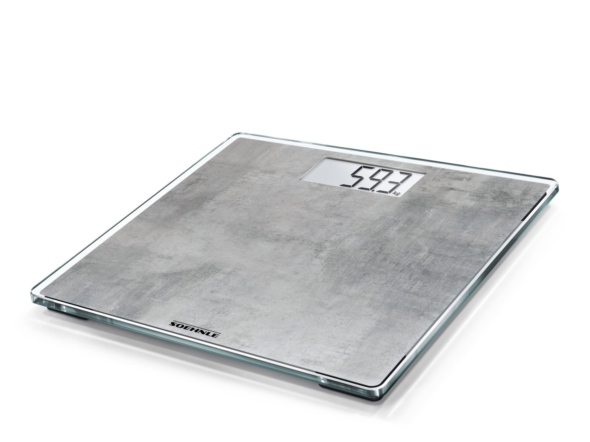 Elektroniczna waga łazienkowa Style Sense Compact 300 Concrete jest atrakcyjnym dodatkiem do każdej łazienki dzięki unikatowej stylistyce przypominającej beton. Ta waga z wysokiej jakości szkła hartowanego oferuje wygodną platformę i nośność do 180 kg. Waga włącza się od razu po wejściu na platformę i na czytelnym wyświetlaczu LCD wskazuje masę ciała z dokładnością do 100 g. Po zakończeniu ważenia waga wyłącza się automatycznie. Dzięki temu jest energooszczędna i zapewnia długi czas użytkowania dołączonych baterii. Przegroda baterii jest mocno przykręcona i dzięki temu bezpieczna dla dzieci.