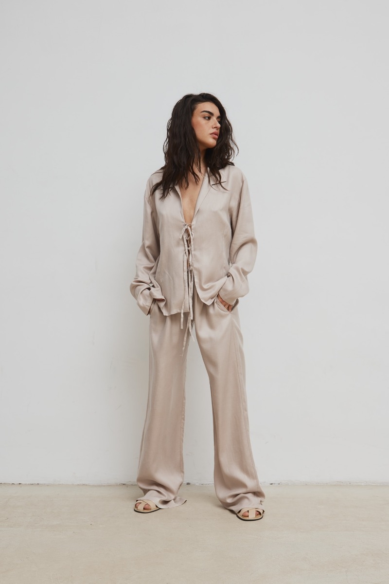 Koszula CASTRO wykonana jest z tkaniny z dodatkiem lnu w kolorze beżowym. Posiada klasyczny kołnierz i długie proste rękawy któe dodają elegancji, a zastąpienie klasycznej listwy guzikowej ciekawymi wiązaniami na różnej wysokości dodaje oryginalności. Model jest niezwykle lekki i zwiewny, co sprawia, że będzie idealny na ciepłe dni. Można zestawić tę koszulę z jeansowymi szortami i sandałami na płaskiej podeszwie dla casualowego looku, lub ze spódnicą ołówkową i szpilkami dla bardziej eleganckiego wyglądu. Ta uniwersalna koszula świetnie sprawdzi się w różnych stylizacjach na nadchodzące lato. Stworzysz TOTALL LOOK ze spodniami ASPRO z tej samej kolekcji . Gramatura tkaniny 160g m² Skład : 90% Tencel, 10% Len Zalecana pielęgnacja :