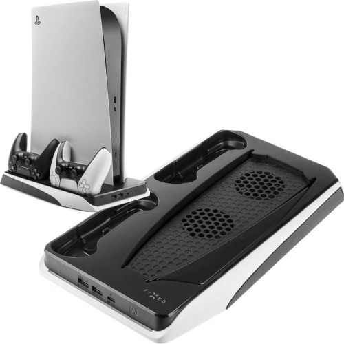 Fixed Multifunctional Stand Station for PS5 Ładowanie 2 kontrolerów DualSense PS5 / podstawka chłodząca dla konsoli PlayStation 5 Wszystko GRA Żeby wygrać trzeba grać, to popularne porzekadło ma w sobie ziarno prawdy. Jedną ze składowych dobrego gracza jest pełne skupienie i komfortowe warunki do gry. Firma Fixed chcąc spełnić te oczekiwania wychodzi z propozycją serii Multifunctional Stand Station for PS5. Jest to cieszące oko wielofunkcyjne urządzenie, które: naładuje 2 Gamepady DualSense PlayStation 5 pełni funkcję podstawki i jednocześnie chłodzi konsolę PS5 posiada uchwyt na 12 gier zawartość pudełka: stacja wielofunkcyjna, wyjmowane 2 magnetyczne złącza dla kontrolerów USB-C, część wymienna dla PS5 Digital Edition, instrukcja w j. polskim, kabel ładujący USB-C (26 cm) *Kontrolery i konsola nie są przedmiotem sprzedaży Kolor producenta: Czarno-biały Proste zasady Ta podstawka kieruje się prostą filozofią obsługi dla Twojej maksymalnej wygody. Posiada gotowe do użycia 2 złącza USB-C, na które tylko odkładamy pady DualSense bez konieczności podłączania ich bezpośrednio do konsoli. Wystarczy je podłączyć do stacji po każdej sesji gry, a zawsze będą gotowe do podboju wirtualnego świata. Samo PS5 łączy się ze stacją dokującą za pomocą kabla USB-C. Aktywne chłodzenie Wykonana z twardego ABSu podstawka, nie rozgrzeje się do czerwoności i będzie z Tobą wiele lat, gdyż posiada wentylatory, które chłodzą urządzenie. Wszystko idzie w parze z efektownym niebieskim podświetleniem. Pełne bezpieczeństwo - ochrona przed przepięciem, przegrzaniem i zwarciem, spełnia wszystkie unijne normy prawne i bezpieczeństwa. Bukiet dobrodziejstw Stacja ładująca FIXED jest zgodna z wersją klasyczną i cyfrową, posiada wyjmowaną magnetycznie nakładkę. Z boku ukrywa się wysuwany segregator, który przechowuje do 12 gier, koniec z bałaganem i szukaniem. Dodatkowe 2 wbudowane złącza USB-A zapraszają do współpracy inne akcesoria np. słuchawki czy smartfon. Trochę szczegółów Wejście USB-C: 5,25 V/3 A Wyjście 1 USB-A: 5,25 V/1 A x2 Wyjście 2 USB-A: 5,25 V/0,5 A x2 Czas ładowania kontrolera DualSense: 3,5 godziny napięcie wentylatora: DC 5V/0,15A x2 prędkość wentylatora: 3000 obr./min długość przewodu ładowania stacji: 260 mm wymiary: 205 x 334 x 43,40 cm waga: 769,5 g