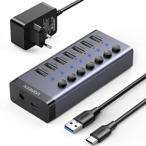 Wielofunkcyjny HUB Ugreen 7w1 Urządzenia z wejściem USB-A Jeden do wszystkiego! Hub cenionej marki Ugreen to produkt najwyższej jakości, który umożliwia efektywne ładowanie aż siedmiu urządzeń jednocześnie, korzystając z jednego gniazdka sieciowego. Jego kompaktowy design pozwala na łatwe zabranie go w podróż, a wykonanie z wysokiej jakości stopu aluminium gwarantuje trwałość przy zachowaniu niskiej wagi. Dzięki zastosowanej technologii Power Delivery, możesz błyskawicznie naładować swoje urządzenia! Kolor producenta: Grey (szary) Zawsze z Tobą To kompaktowe urządzenie o niewielkich rozmiarach, które bez trudu zmieścisz w torbie na laptopa, sprawiając, że jest idealne do zabrania w podróż. Jego praktyczny design umożliwia wygodne korzystanie z wielu urządzeń jednocześnie, a także znacząco oszczędza miejsce. Dzięki niemu możesz cieszyć się pełną funkcjonalnością i komfortem, niezależnie od miejsca, w którym się znajdujesz. Wszystko w jednym miejscu Doświadcz niezwykłej szybkości ładowania dzięki rozdzielaczowi z siedmioma portami USB 3.0 typu A, z pełną zgodnością z technologią Power Delivery. Teraz możesz jednocześnie naładować aż siedem urządzeń i to w ekspresowym tempie. To idealne rozwiązanie dla osób potrzebujących efektywnego i szybkiego ładowania wielu gadżetów jednocześnie. Specyfikacja Marka: Ugreen Rodzaj: HUB Porty: 1x USB-C (tylko transmisja danych), 7x USB-A z standardem Power Delivery 3.0 Prędkość transferu USB: do 5 Gb/s Materiał wykonania: Aluminium Prąd wejściowy: 12V/2A W zestawie: HUB Ugreen, kabel USB-A - USB-C, ładowarka sieciowa 12V/2A