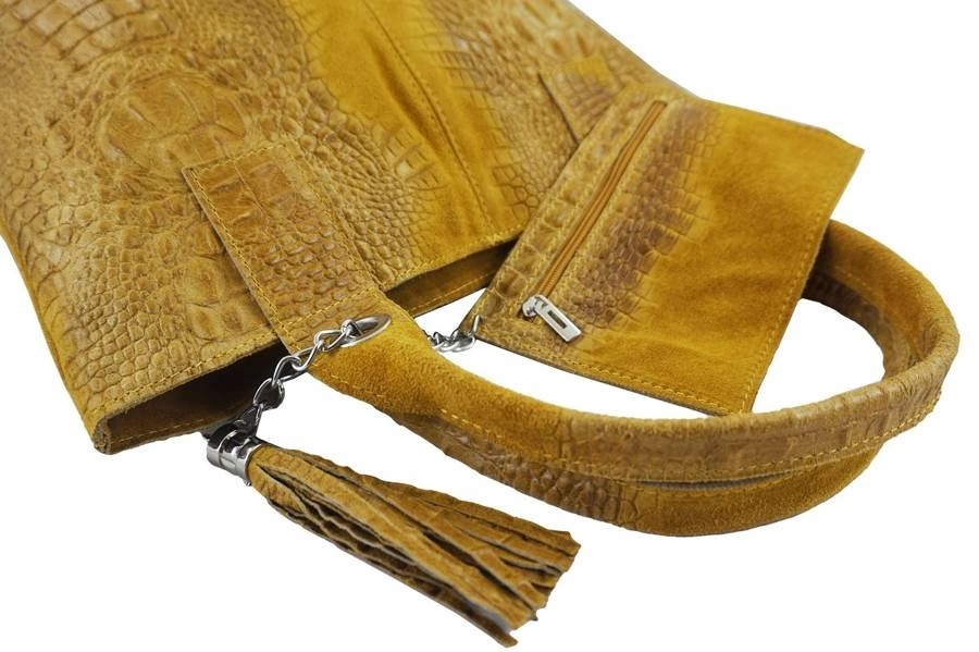 Modny worek skórzany - CROCO został wyprodukowany we Włoszech, wykonany ze skóry naturalnej zamszowej. Propozycja sklepu internetowego - torebka, która uzupełni swobodne stylizacje. Miękka zamszowa skóra naturalna, wygodnej długości uchwyty, modny frędzelek i zwierzęcy motyw - wszystko to gwarantuje, iż Twoja stylizacja będzie wyjątkowa. Modny worek skórzany typu shopper, mieszczący format A4, na wygodnej długości uchwytach idealnie komponuje się ze swobodnymi casualowymi stylizacjami do pracy oraz na uczelnię. Skorzystaj z naszej oferty i odbierz rabat -15% za zapisanie się do newslettera.