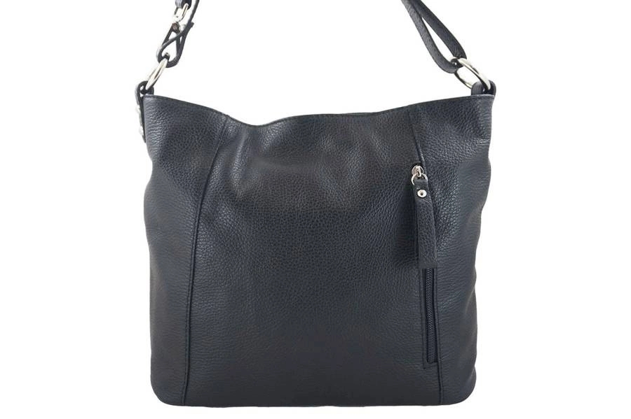 Wnętrze worka: jednokomorowe wnętrze jest wykończone podszewką i podzielone na pół dużą zasuwaną kieszenią mieszczącą kosmetyki oraz małą butelkę wody. Dodatkowo wyodrębniono małą zasuwaną kieszonkę mieszczącą np. portfel oraz miejsce na telefon. Pojemny skórzany worek na ramię jest zasuwany, posiada srebrne okucia oraz metalowe stopki na usztywnionym spodzie. Dwie zasuwane kieszenie na zewnątrz umożliwią szybki dostęp do kluczy oraz biletu komunikacji miejskiej. Boczna pionowa kieszeń z przodu ozdobiona jest skórzanym paseczkiem. Dużym atrybutem tego modelu jest możliwość noszenia torebki na podwójnym lub pojedynczym pasku - na ramieniu lub wygodnie przewieszonej przez ramię. Długość oraz wysokość pojedynczego paska: 90cm / 46cm; długość oraz wysokość paska podwójnego: 52cm / 23cm. Pasek mocowany jest na dwóch metalowych srebrnych kołach.