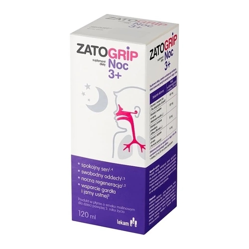 Suplement diety Zatogrip Noc 3+ przeznaczony jest do stosowania u dzieci powyżej 3. roku życia. Preparat uzupełnia codzienną dietę w ekstrakt z korzenia prawoślazu, kwiatów lipy i szyszek chmielu, dzięki czemu wspiera komfort oddechowy podczas snu.