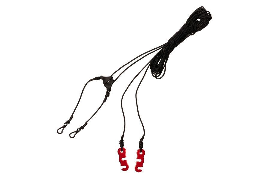 To bardzo prosty, bezwęzłowy model zawiesi, który przyśpieszy rozwieszanie naszego zadaszenia. A jak wszyscy dobrze wiemy, przy niepewnej pogodzie, każda sekunda jest na wagę złota. 7 metrów cięciwy w zupełności wystarcza nawet przy większym rozstawie drzew. Po zapięciu odciągów na głównej cięciwie mamy stale napięty tarp.