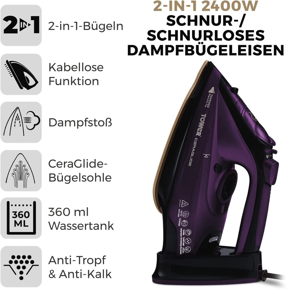 Żelazko bezprzewodowe TOWER T22008VDE nagrzewa się w mniej niż 30 sekund i zapewnia strumień pary 120 g/minutę oraz strumień pary 150 g/minutę, aby wycelować i wyeliminować uporczywe zagniecenia.