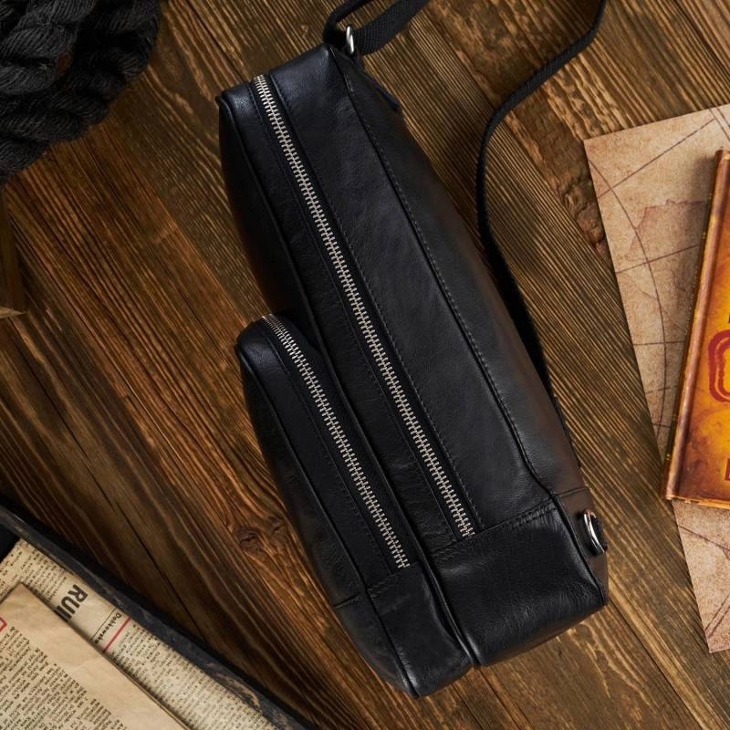Męski plecak na jedno ramię został wykonany z wysokiej jakości skóry naturalnej, powlekanej ochronną warstwą przeciw wilgoci i zarysowaniom. Akcesorium posiada przednią kieszeń i pakowną komorę główną z dwoma wsuwanymi kieszonkami. Bawełniany pasek został wzmocniony skórzanymi wstawkami – odpowiednio przypięty umożliwia noszenie plecaka na lewym lub prawym ramieniu i na skos.