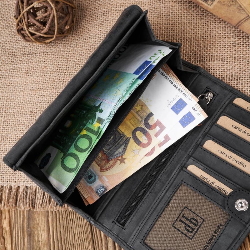 Duży portfel damski został wykonany z wysokojakościowej skóry naturalnej hunter. Pakowne wnętrze: bilonówka zapinana na solidną napę, dwie przegrody na gotówkę i pięć schowków (w tym dwa zapinane na suwak) z pewnością pomieszczą wszystko, czego potrzebujesz na co dzień. Coraz częściej korzystamy z kart płatniczych - sześć przegródek to spora ilość miejsca do przechowywania. Wiemy, że wiele z nas ma w portfelu zdjęcia bliskich osób. Z tego powodu powstała półtransparentna kieszonka dedykowana właśnie w tym celu. Portfel wyposażony jest w dodatkową warstwę ochroną RFID, która zapobiega przed kradzieżą poufnych danych z kart kredytowych. To skutecznie zapobiega przesyłowi i identyfikacji informacji znajdujących się na dokumentach – zminimalizuj ryzyko, dzięki modelowi T-01!