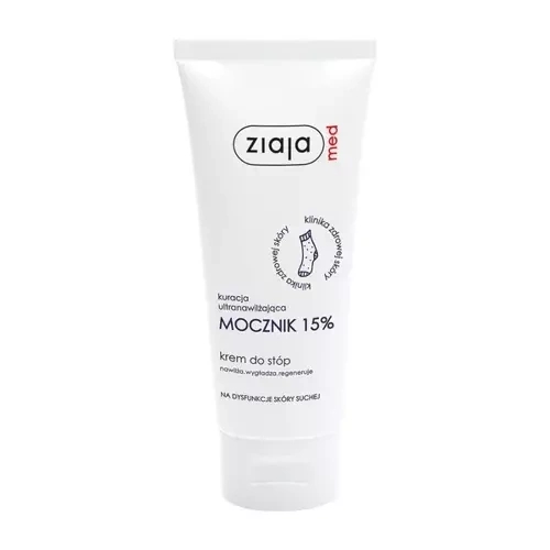 Ziaja Med Kuracja Ultranawilżająca Mocznik 15% krem do stóp to preparat, który nawilża, wygładza, zmiękcza i regeneruje. Skutecznie poprawia wygląd i kondycję bardzo suchej, szorstkiej i popękanej skóry stóp. Krem mogą stosować także diabetycy.